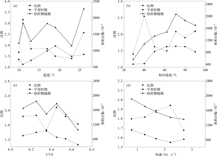 由2.3节分析可知,秸秆燃烧排放的CO可能被排放源调查严重低估。这里进行简单、快速的检验。露天秸秆燃烧主要发生在4—10月,尤其是5,6,10月最为严重[22-23],将这3个月定义为秸秆燃烧期,将4,7,8,9月定义为平常时期。图 4是不同温度、湿度、风速和UVB辐射值区间下秸秆燃烧期与平常时期CO体积分数及两种情况下的CO体积分数比值。秸秆燃烧期的CO体积分数明显高于平常时期的CO体积分数,两者比值在1.4~3.2之间,平均为1.9,相对标准差为30%。两个时期平均的体积分数比代表秸秆燃烧排放引起的CO体积分数的相对增长,可见,估算CO秸秆燃烧时期比平日多排放了90%(±30%)。由于一些排放源清单或者不考虑露天秸秆燃烧,或者在估算中存在很大误差,因此,秸秆燃烧期CO的排放量可能被低估。如果居民生活方面的排放也被低估,出现上述1倍以上的差值是完全有可能的。当然,这一判断还需要从不同角度来检验,此外,也需要对其他地区的估算进行验证 (详见文献[24])。