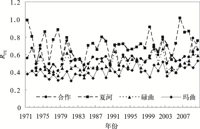 近40年甘南草原RPE呈明显上升的趋势 (图 2),玛曲RPE上升趋势达0.03/10 a (超过0.01显著性水平),合作、碌曲RPE上升趋势也达0.03/10 a (超过0.05显著性水平),夏河RPE上升趋势达0.02/10 a (未通过显著性检验)。甘南草原RPE在20世纪70年代到80年代变化不明显 (表 1),除玛曲略上升外,合作、夏河、碌曲均呈下降趋势,其中夏河20世纪80年代比70年代下降了0.1。分析发现,70年代多数年份夏河降水量以偏少为主,而70年代到80年代夏河生物温度年际变化趋势不明显,从而导致这种现象。到90年代甘南草原RPE明显上升,合作、夏河、碌曲和玛曲1991—2010年平均RPE比1971—1990年平均RPE分别高出0.06,0.05,0.08和0.06,分别上升了11.0%,7.7%,17.2%和16.6%,以碌曲、玛曲上升最明显,20世纪90年代后甘南草原出现了明显的暖干化趋势,其中以位于甘南南部的碌曲、玛曲最为明显。