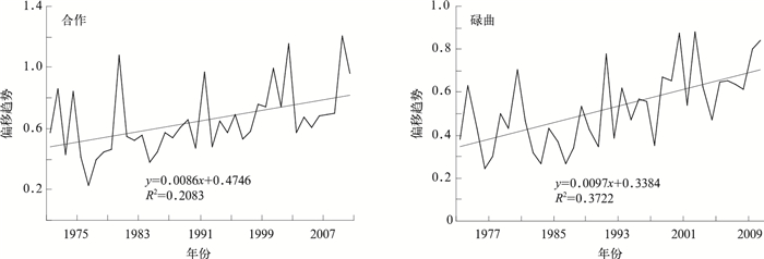 | 图 3. 1971—2010年合作、碌曲Holdridge生命地带的偏移趋势 Fig 3. The moving tendency of Holdridge life zone for Hezuo and Luqu during 1971—2010 | |