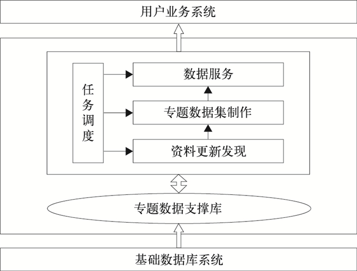 该系统的系统结构如图 1所示,主要由1个专题数据支撑库和4个功能模块组成。专题数据支撑库负责获取基础数据资料和管理系统运行所需信息。功能模块包括资料更新发现、专题数据集制作、数据服务和任务调度。其中,资料更新发现驱动专题数据集制作,制作出的数据产品通过数据服务提供用户使用;任务调度根据业务规则,衔接资料更新发现、专题数据集制作和数据服务,以实现整体的业务流程。