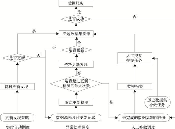 在正常情况下,实时自动调度完成所有数据集制作和服务。根据资料的更新发现策略,调度资料更新发现模块,若已更新则启动数据集制作和服务,否则,记录资料未更新信息,交付给异常处理调度。