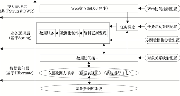 其次,该架构通过一系列的配置管理,来支撑系统的灵活度和可扩展性。主要配置包括两类:业务逻辑配置和框架参数配置。业务逻辑配置是从业务功能实现中抽取出的通用配置信息,配置所用XML (eXtensible Markup Language) 文件架构 (Schema)[20]由系统自行设计;本系统中该类配置包括专题数据集参数配置、任务启动策略配置等。框架参数配置是支撑开源框架运行的配置,配置所用XML文件的架构由框架自身定义;本系统中所使用的开源框架主要有Hibernate,Spring,Struts和DWR,其配置分别为对象关系映射配置、对象管理参数配置、同步Web访问控制配置和异步Web访问控制配置。