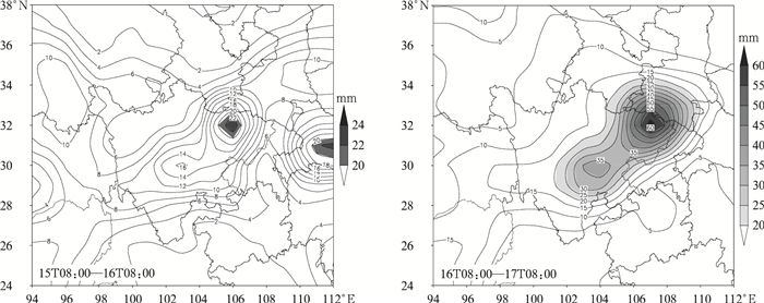 2 西南涡引发的大范围强降水概况及环流背景 2.1 降水分析这次强降水过程主要出现在2010年7月16—18日,19日降水减弱,大范围降水主要出现在川东北和川南地区,雨带呈东北—西南走向。最强降水时段出现在17日02:00—17日08:00,最大值出现在万源县。从7月16日—17日24 h累积降水量演变 (图 1) 来看,15日08:00—16日08:00降水主要出现在广元—巴中一带,降水强度不大。16日08:00—17日08:00降水范围扩大,雨带逐渐呈东北—西南走向。主要有两个强降水中心,分别位于巴中和乐山地区。与15日08:00—16日08:00对比,位于巴中的降水中心强度增大,可达到大暴雨级别。17日08:00—18日08:00雨带继续扩大,雨带东北—西南走向明显,位于乐山的降水中心向川南移动。18日08:00—19日08:00两个降水中心分离并移出四川地区,最大值出现在乐山市 (29°N, 103°E),24 h降水量达243 mm,四川省有32个县市降水量超过50 mm;17日08:00—18日08:00降水中心在宣汉县 (31°N, 107°E),降水量达141 mm,有19个县市降水超过暴雨级别。因此,由24 h累积降水量分析可知,16日20:00—17日08:00是此次暴雨的主要发生时段,暴雨区主要位于川东北和川南地区。已有研究指出,2010年7月中旬四川盆地发生的持续性暴雨过程,西南涡的发生发展及其沿辐合线的移动是造成此次强降水的主要原因[14-15]。