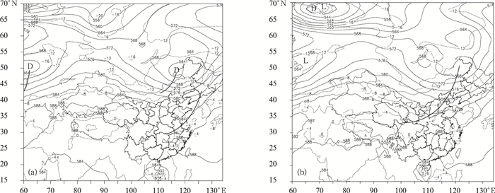 | 图 2. 2010年7月500 hPa高度场 (实线,单位:dagpm) 与温度场 (虚线,单位:℃) (a)16日02:00,(b)17日02:00 Fig 2. 500 hPa height field (solid line, unit:dagpm) and temperature field (dashed line, unit:℃) (a)0200 BT 16 July 2010, (b)0200 BT 17 July 2010 | |