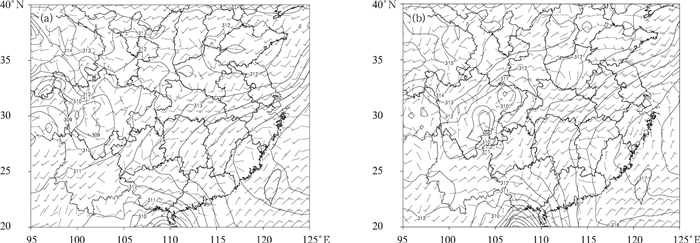 | 图 3. 2010年7月16—17日700 hPa高度场 (实线,单位:dagpm) 与风场 (风矢) 分布 (a)16日20:00,(b)17日08:00 Fig 3. 700 hPa height field (solid line, unit:dagpm) and wind field (vector) (a)2000 BT 16 July 2010, (b)0800 BT 17 July 2010 | |