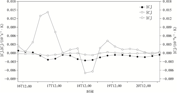 3.1 CVV各分量与6 h累积降水量的关系利用式 (2) 和式 (4) 计算了CVV各分量的垂直积分[Cx], [Cy], [Cz]。本文选取降水发生的主要区域28°~34°N,100°~108°E进一步做区域平均 (九点平滑),得出区域平均的[Cx], [Cy], [Cz]。