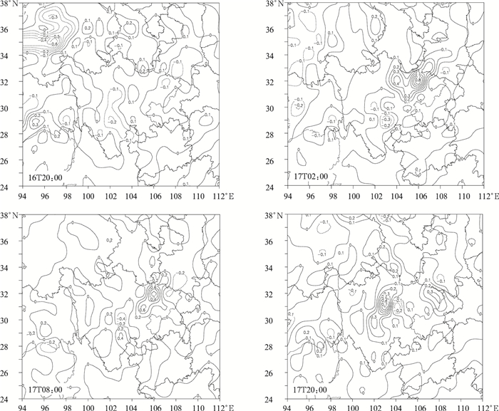 由图 5可以看到,7月16日20:00 CVV垂直分量在对流层低层850 hPa的分布可以看到,Cz值较小,没有出现明显的正负值中心,四川省内大部为正值区域,此时川东北和川南已有降水产生。17日02:00,四川省东北部即巴中、广元一带为CVV垂直分量正值区控制,正值区内有两个中心,其中范围较大、强度较强的中心位于32°N, 106°E附近,另一个较弱的中心位于32°N, 104°E。随着西风槽的南压,低层气旋性涡旋的生成,CVV垂直分量的正值区范围扩大,中心强度也有所加强。17日08:00盆地地区的中心值达到0.7×10-10 m2·s-1·K·kg-1,CVV垂直分量正值区呈东北—西南走向,同时在川南地区 (28.5°N, 103°E) 也有一弱的正值中心形成。位于川东北与川南两个主要的降水区域与CVV垂直分量的正值区对应,即正值中心同时也是暴雨区。正值较大等值线密集带的川东北中心恰好对应较强的降水中心。17日14:00川南的弱正值中心北移,范围扩大,强度增强,中心值达到0.5×10-10 m2·s-1·K·kg-1(图略)。川东盆地的正值中心逐渐减弱消失,对应的川东降水减弱,而川南地区降水仍较强。17日20:00川南CVV垂直分量的正值区范围有缩小趋势,延伸至四川中部地区,但中心强度维持不变,降水持续 (图 5)。18日02:00川南的CVV垂直分量正值范围明显缩小,随之降水减弱 (图略)。18日08:00,CVV垂直分量正值中心减弱消失,暴雨过程结束 (图略)。