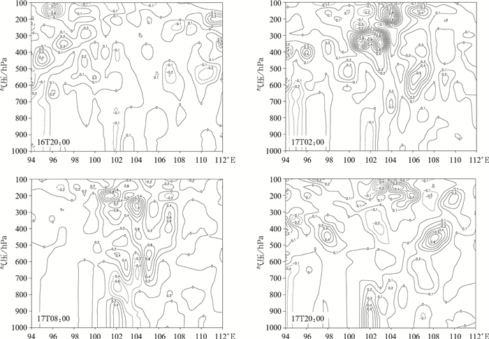 3.3 CVV垂直分量的垂直分布和演变沿暴雨中心30°N做CVV垂直分量Cz的垂直剖面 (图 6)。由图 6可以看出,16日20:00,即暴雨发展初期,垂直结构上暴雨区100°~105°E之间从低层至高层大部分为Cz的正值区,在102°E附近的700 hPa以下低层呈现Cz负值,且数值较小。17日02:00暴雨区对流层高层300 hPa附近出现CVV垂直分量的两个高值区,高值中心分别位于101°E和103°E,正值范围逐渐向对流层低层扩展。在103°E左右的Cz从低层至高层呈现一致的正值,高层最大值达到1.1×10-10 m2·s-1·K·kg-1,此时降水发展强烈。17日08:00高层的正值中心东移,中心强度达到1.2×10-10 m2·s-1·K·kg-1。正值区范围向下扩展至对流层低层700 hPa附近,800 hPa附近存在一小范围的CVV垂直分量负值区。对流层CVV垂直分量从高层至低层呈现“正负正”的配置,而非一致的正值,此时暴雨程度有所减弱。17日20:00暴雨区上空750 hPa以下为CVV垂直分量的高值区,正值中心强度较前几时次减弱,仅为0.5×10-10 m2·s-1·K·kg-1,而高层正值中心消失,降水强度相应减弱。