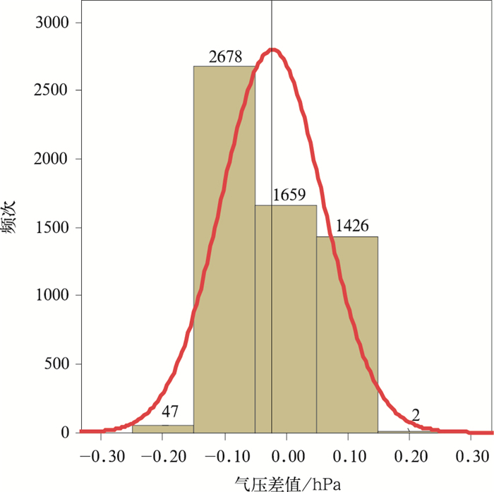 安庆站双套站AB站差值平均值为-0.02 hPa,即A站数据值略低于B站数据值,中心值左偏。由标准差为0.08 hPa可以看出,差值比较稳定,变化幅度较小。由图 1可知,平均值右侧样本3087个,分布在0, 0.1, 0.2 hPa上,平均值左侧2725个样本,分布在-0.3,-0.2,-0.1 hPa上,偏度系数略大于0,也表明平均值两侧分布基本对称,右侧分布略为分散些。峰度系数小于0,表明分布的凸起程度大于正态分布的凸起程度,即曲线较为陡峭,数据更为集中,加之其右侧略微分散,这样其差值分布将不服从正态分布。图 1表现出了上述特点,其差值为0.0 hPa,共1659个样本;在±0.1 hPa之间,共5763个样本,占所有差值的99.2%。与两组气压差值的一致率相同,而粗差率仅为0,表明了两组气压数据变化较为一致,无异常值 (表 3)。