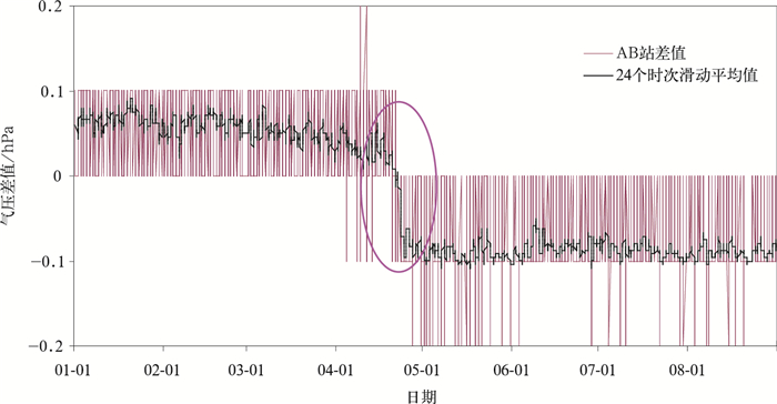 通过对仪器差值的最大允许误差的监控可以及时发现较大的数据异常问题,但是部分微小的仪器系统误差却难以发现,需进一步的分析差值滑动均值的变化特征。图 2给出了安庆站AB站2011年1月1日—8月31日逐小时的气压差值变化情况,并给出了24个时次的滑动平均值。由图 2可知,AB站差值全部在允许误差范围内,其最大值为0.2 hPa,最小值为-0.2 hPa,但2011年4月20日前后差值的滑动平均值有明显的变化。经查4月20日前后无维护及更换等操作,而1月1日至4月中旬气压差值相当稳定,基本在0~0.1 hPa范围内变化,而4月19日开始气压差值开始出现-0.1 hPa,4月22日以后则全部为0,-0.1,-0.2 hPa。因此初步判断4月20日前后其中一套传感器经过4个多月的运行逐渐产生了一定的系统性误差 (2011年1月1日A,B站均更换了鉴定合格的仪器)。对于单套运行的自动气象站这种误差可能只有在仪器年检时才能发现,而双套站利用对差值以及差值平均值的跟踪,可以及时发现这种细微变化,进行仪器维护,从而提高数据质量。