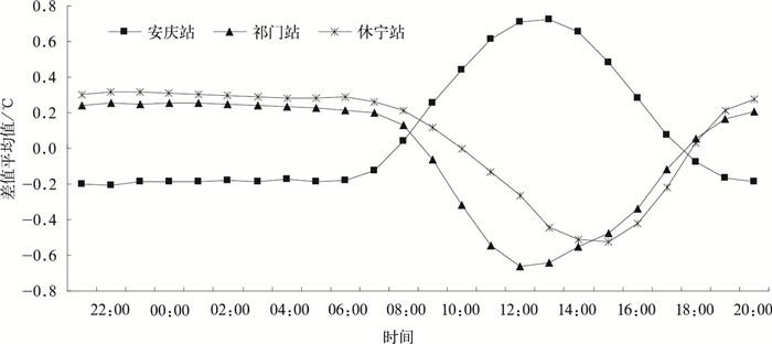 目前单套自动气象站的仪器可能由于仪器安装、管理维护和仪器对辐射的敏感性等不同的原因而出现明显的日变化特征。图 3给了安庆站、休宁站和祁门站24个时次5 cm地温AB站差值平均值的变化情况。如祁门站AB站差值呈现了明显的日变化规律。在21:00—次日08:00的时间段里,A站观测地温数据比B站高,且差值较为稳定;但09:00—17:00 A站观测地温数据低于B站,且08:00—12:00差值呈现明显递减趋势,而12:00—20:00差值呈现递增趋势。安庆站和休宁站的地温差值也有类似的变化。这种变化说明其中1套自动气象站存在明显的日变化规律,这种变化在自动气象站单套运行时很难发现,从而使数据长期存在质量问题,而双套自动气象站可以通过对差值日变化的监控等及时发现这种变化,保证数据质量。