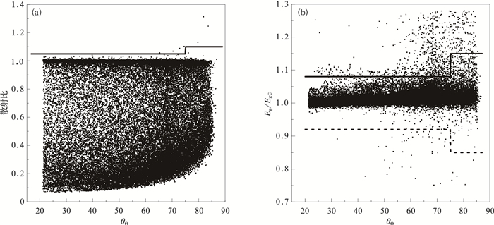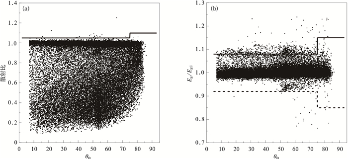 相关要素比较限制检验主要是针对太阳短波辐射数据的判断方法,通过对一定太阳天顶角下的直接辐射、散射辐射、观测总辐射和计算总辐射之间的比率进行限制,从而了解它们之间的配合是否合理,并做出相应的质量评估 (具体算法见文献[13],阈值见表 3)。这一层质量检验对各辐射量观测数据准确度的变化具有很高的灵敏性。若比率在规定的上下限范围内,则其相应的辐射量数据可被确定为可靠;若比率在上下限范围外,则暂时无法准确判断是其中哪一个 (散射辐射或直接辐射) 或几个辐射量数据出现问题。散射比检验为第3层质量控制的第一步,理论上散射辐射小于总辐射,但由于散射辐射表还会接收到周围环境的散射能量,使得Ed/Eg(Eg为CM21总日射表测量的太阳总辐射值) 的值很有可能略大于1(特别在高太阳天顶角的情况下)。散射比检验只设有上限,只能对散射辐射观测值异常偏大的数据进行标记,因此若要进行更全面、精细的质量评估,需对通过散射比检验的数据继续进行Eg/EgC检验。理论上这个比率为1,但由于仪器自身的一些特征,比如日射表的余弦响应、在高太阳天顶角下双轴跟踪太阳的准确性误差等会使这个比率常偏离理论值。