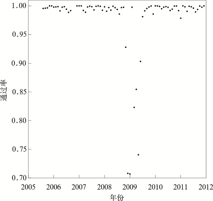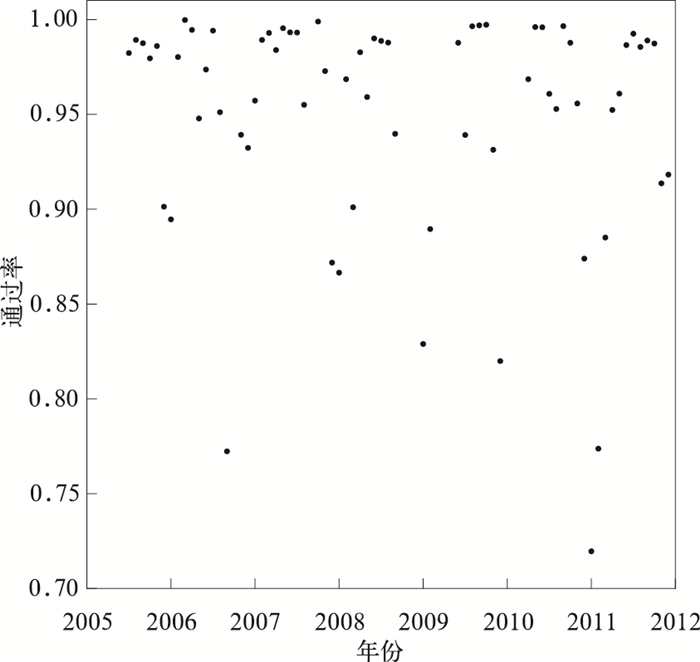 表 5给出了2005—2011年龙凤山区域大气本底站各辐射数据的前两层通过率情况。从表 5可知,龙凤山站总辐射表与长波辐射表的运行状况较好,缺测以及无效数据所占的比例均不足1.5%;散射辐射与直接辐射观测系统的运行状况较差,缺测率分别达到了13.3%与21.5%。主要原因包括:① 2005—2011年龙凤山站2AP系统多次因出现故障 (2006年下半年、2008年9月—2009年2月、2009年12月—2010年3月) 而无法正常跟踪太阳,导致散射辐射表与直接辐射表产生了较长时间的缺测或无效数据;② 2006—2009年直接辐射表与数据采集器的连接时常出现异常,导致采集到的直接辐射有较多的缺测或无效数据。