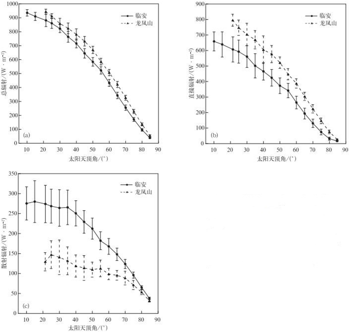本文统计了2005—2011年晴空条件下直接辐射占总辐射的百分比平均值,临安站为55.45%,龙凤山站为70.82%,即在这两个区域直接辐射所占比例较大,因此尽管散射辐射在临安地区比较大,但对于总辐射仍是龙凤山地区较大。晴空条件下的直射比可以反映大气气溶胶对太阳短波辐射的散射程度。在低太阳天顶角情况下,直接辐射在总辐射中占主导地位,但随太阳天顶角的升高,直接辐射所占总辐射比例不断减小,当降至50%时,散射辐射开始在总辐射中起主导作用,本文将此时对应的太阳天顶角定义为临界角。对于临安站,临界角约为70°;而对于龙凤山站,临界角约为80°。这也能说明临安地区的大气浑浊度较龙凤山地区大,空气质量状况较龙凤山地区差。