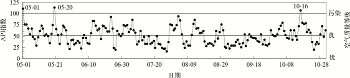 | 图 1. 2010年上海世博会期间API指数分布 Fig 1. Distribution of daily API during the 2010 World Expo in Shanghai | |