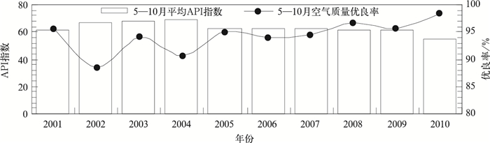 | 图 2. 2001—2010年世博会同期上海平均API指数及空气质量优良率的年际分布特征 Fig 2. Interannual distribution of the average API index and the good air quality rate during the same World Expo period of 2001—2010 in Shanghai | |