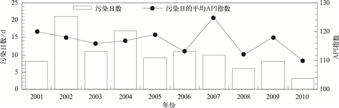 | 图 3. 2001—2010年世博会同期上海污染日及污染日平均API指数年际分布 Fig 3. Interannual distribution of pollution days and its average API index during the same World Expo period of 2001—2010 in Shanghai | |