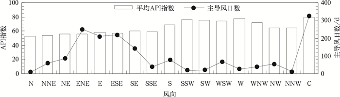 | 图 4. 2001—2009年世博会同期上海日主导风分布及对应的平均API指数 Fig 4. Distribution of the prevailing winds and average API index during the same World Expo period of 2001—2009 in Shanghai | |