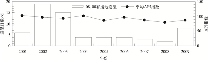 另外,2010年世博会期间上海08:00接地逆温出现仅为1 d,是2001年以来同期最少,其对应的API指数为44,也是10年来08:00出现接地逆温时最低的API值。