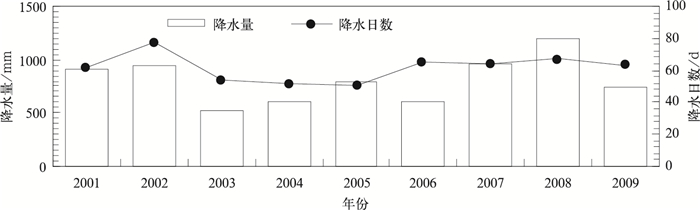 | 图 6. 2001—2009年世博会同期上海降水量和降水日数年际分布 Fig 6. Interannual distribution of the cumulative precipitation and rain days in Shanghai during 2001—2009 | |