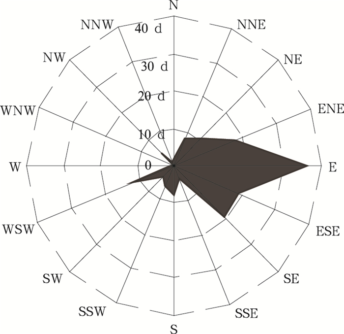3.1 近地面风场特征及其影响基于16个方位风向和静风 (风速不大于0.2 m·s-1) 统计的2001—2009年世博会同期共1656 d的上海主导风分布特征 (图 4) 显示,最多的主导风为静风 (C)(324 d,约占19.6%),其样本日的平均API指数也是最高 (80);剩余的1332 d中,NNE-SSE象限 (即偏东风,1006 d,约占60.7%) 出现的日数明显多于SSW-NNW象限 (即偏西风,240 d,约占14.5%),其对应的平均风速也是偏东风 (2.16 m·s-1) 明显大于偏西风 (1.84 m·s-1),但对应的平均API指数则是偏西风 (72) 明显高于偏东风 (57)。对比分析9年来世博会同期污染日的主导风分布特征 (图略),静风下污染日出现最多,为60 d,约占静风总样本数的18.5%;偏东风影响情况下污染日出现16 d,约占其样本数的1.6%;偏西风影响情况下污染日出现21 d,约占其样本数的8.8%。即上海5—10月静风出现的比例最高, 静风情况下污染物平均环境浓度和污染日出现的比例也最高;另外,该季节里偏东风明显多于偏西风,但在偏西风影响情况下平均风速偏小, 污染物的平均环境浓度和污染日出现比例都明显高于偏东风影响情况。