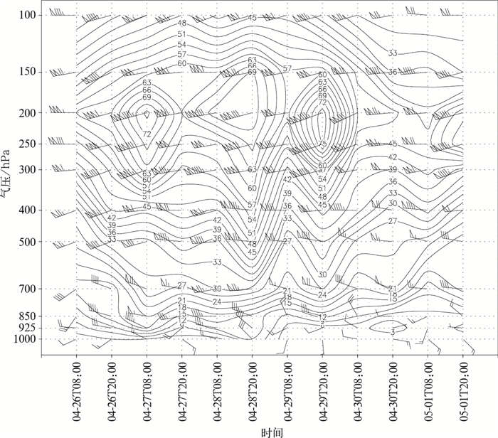 | 图 8. 2010年4月26日—5月1日上海宝山站高空风时序图 (图中等值线为等风速线,单位:m·s-1) Fig 8. The time profile of upper wind at Baoshan Station in Shanghai from 26 Apr to 1 May in 2010 (the isoline denotes the isotad, unit:m·s-1) | |
