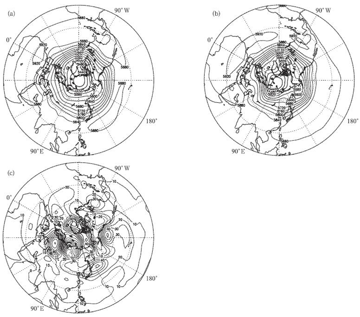 | 图 9. 1981—2010年夏季500 hPa环流气候平均场 (a)、2010年同期环流平均场 (b) 及2010年距平场 (c)(单位:gpm) Fig 9. 500 hPa average circulation in summer during 1981—2010(a) and the circulation in 2010(b) with its anomaly (c)(unit:gpm) | |