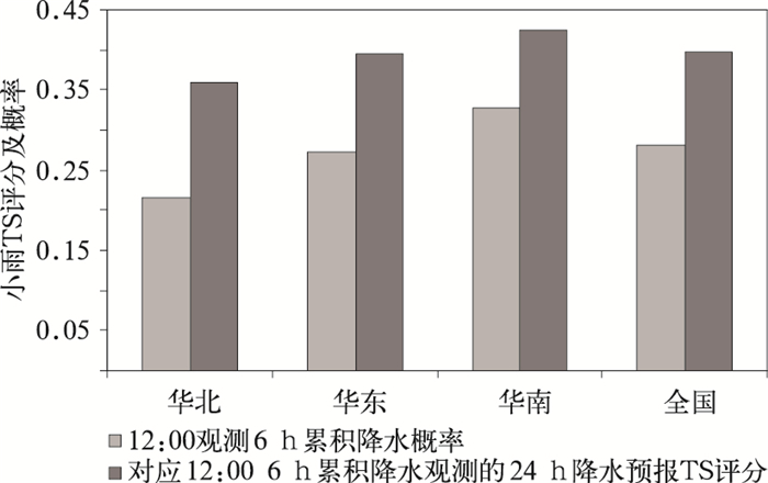 | 图 1. 不同区域中心12:00 6 h观测降水概率及与该观测对应的GRAPES_Meso在各区域中心模式范围24 h降水预报TS评分 Fig 1. The 6 h rainfall probability for 1200 UTC observation and corresponding TS of GRAPES_Meso rainfall forecast against 24 h forecast in different regional centers | |