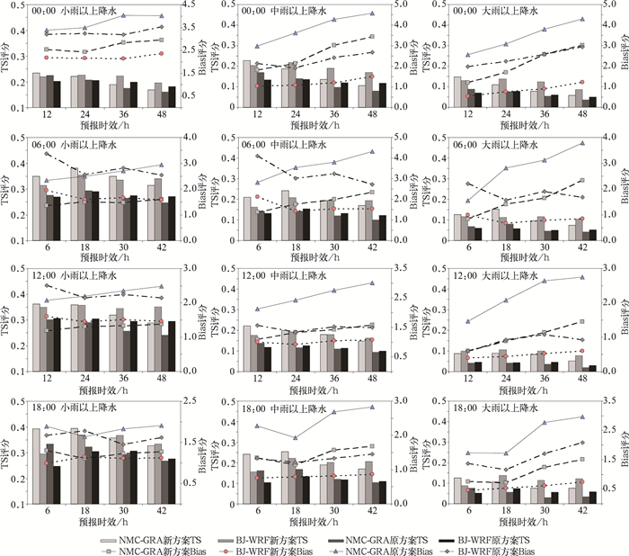 此外,对于新方案而言,中国气象局数值预报中心模式在下午的降水预报上优势较原方案更明显一些,大部分预报时效的大雨以下各级评分略高于华北模式,而原方案的结果与此不同。比较这两个模式的参数化方案发现,二者的积云参数化方案不同,华北模式采用K-F方案,而中国气象局数值预报中心模式采用BM方案。研究表明,BM方案[13-15]主要对尺度较大的中小级别降水描述得较好,而K-F方案[16-17]有利于对流性降水或较强降水的预报水平提高。从统计数据来看,华北地区下午的降水统计检验也符合这一规律。分析平均方法,大尺度降水在新方案中权重较大,而相应的小尺度降水或局地降水在新方案中的影响会大大减少。