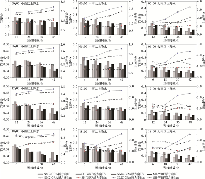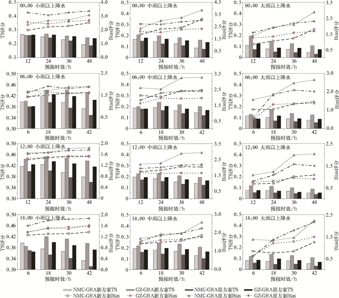 2.2 华南模式华南模式区域降水概率在3个区域模式中最高,除00:00预报外,其小雨评分基本上是所有区域最高。但由于其降水多是热带系统影响所致,且海上资料缺乏,同时模式对热带系统预报略差于对中纬度系统预报效果,华南中雨和大雨预报评分并没有明显高于另外两个区域的评分。但是,除了短时夜雨预报外,华南模式的TS评分基本高于中国气象局数值预报中心模式,尤其是新方案大雨的评分远高于后者,较原评分方案提高约50%(图 3)。