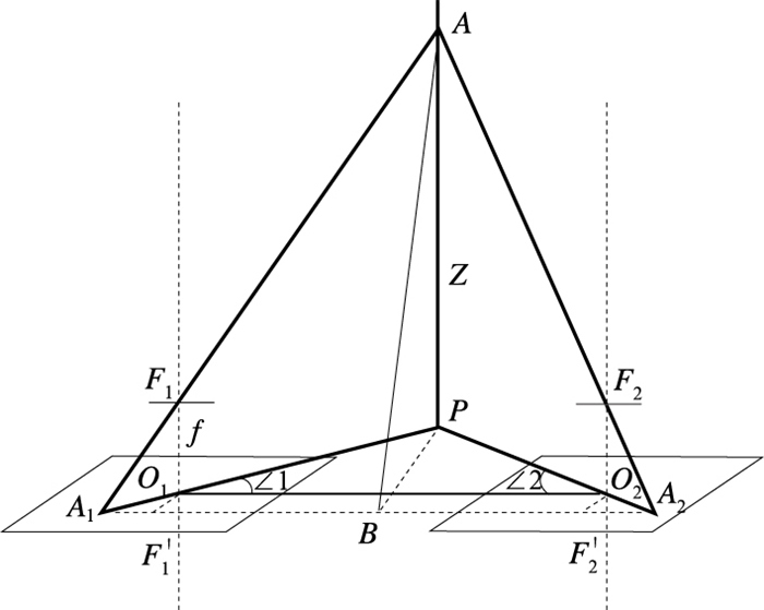设两相机之间的距离 (基线长) 为|O1O2|=d,A为被测目标物,Z为目标物相对像平面的垂直距离,P为垂足,F1,F2为焦点,f为焦距 (单位像素点数);A1,A2为A点在两像平面上的投影点坐标,分别为 (x1, y1),(x2, y2); F1F′1, F2F′2, AB垂直于A1A2。