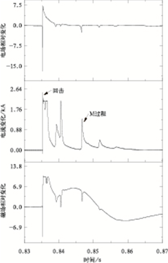 3) M分量在波形时间相关性具有如下特征:持续时间方面,电场与电流的相关系数为0.64,磁场与电流波形的相关系数为0.62;10%~90%上升时间方面,电场与电流和磁场与电流波形的相关系数分别为0.69和0.86;波尾时间方面,电场与电流波形的相关系数为0.39,磁场与电流波形的相关系数为0.55;半峰值宽度方面,电场与电流和磁场与电流波形的相关系数分别为0.77和0.76。
