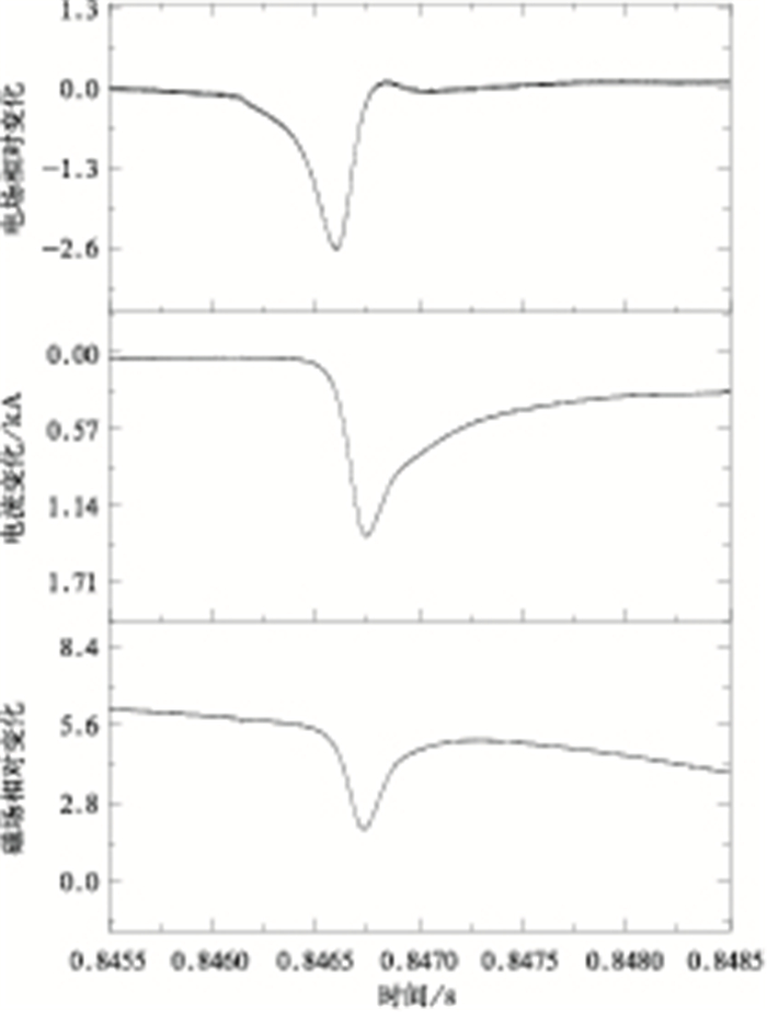 M分量以持续时间较短的U形 (或钩状) 电场变化为主要特征,即在近距离观测到的M分量电场变化以负电场变化开始,紧接着是一略大的正电场变化[1]。图 1给出了2010年7月21日15:00 (北京时,下同) 同步观测到的触发闪电第2次回击之后的M分量电流、近距离电场和磁场的波形。由图 1可知,3种资料中M分量几乎同时发生了相应的变化。在电场波形上M分量表现出了明显的U形变化,具有明显的对称结构特征。在电流波形上,M分量呈现单极性,峰值小于回击峰值,上升沿时间大于回击的上升沿时间,波形也呈对称结构。近距离磁场资料上,由于叠加了静磁场和辐射场,导致波形并不标准。通过观察放大之后的波形 (图 2) 不难发现,磁场资料与电流资料的时间尺度对应性较好,整体波形同样表现出良好的对称性。