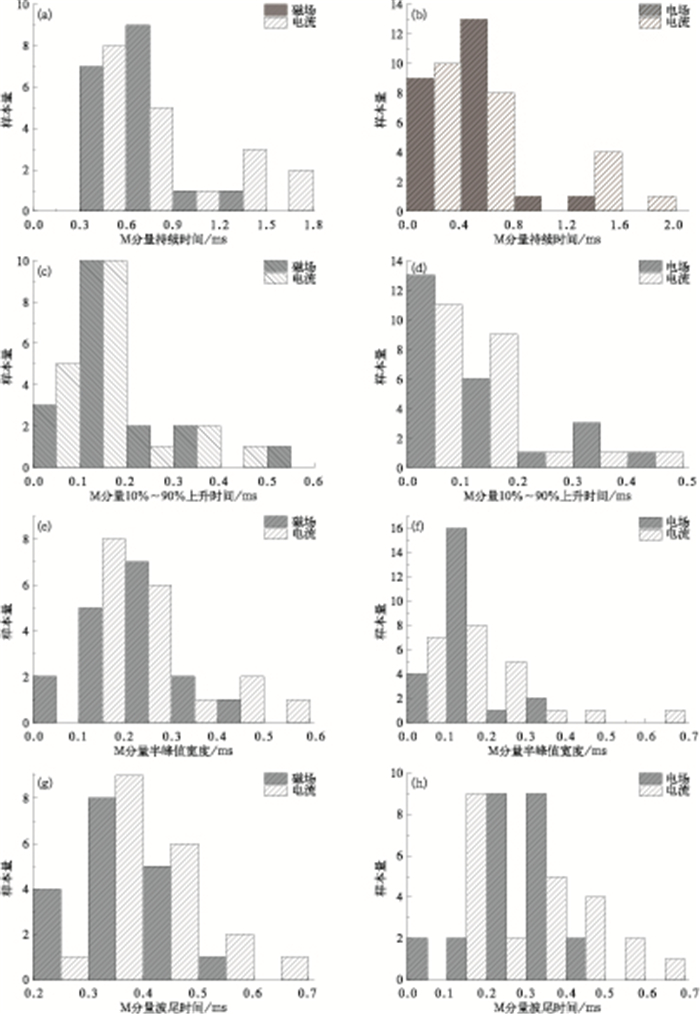 由以上结果可知,电磁场资料与电流资料中M分量的各项参数的统计结果十分接近,且标准偏差较小数据比较稳定,上述统计结果表明三者具有较好的一致性。另外,上述结论是对3种不同数据进行合理滤波处理后得到的,根据以往的研究结果,可以认为在500 Hz~20 kHz通带范围内,保留了M分量的主要成分,滤波处理虽然降低了原始数据的带宽,但对于M过程本身来说,其通带范围与M分量的时间尺度相匹配,统计结果具有实际应用价值。