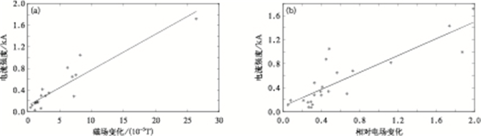 | 图 6. 磁场与电流峰值 (a) 及电场与电流峰值 (b) 散点图 Fig 6. Scatter of amplitude of current versus magnetic (a) and current versus electric (b) | |