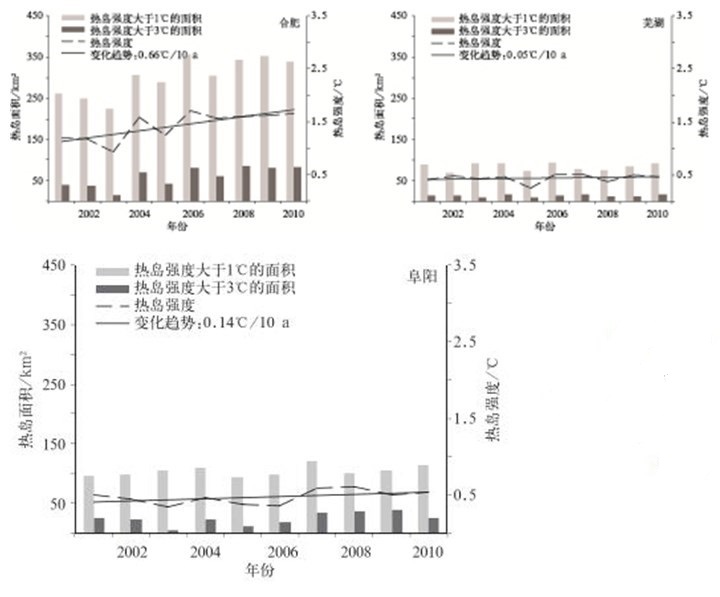 综上所述,合肥、芜湖、阜阳在白天和夜晚均存在不同等级的热岛效应,其中以合肥市的热岛效应最为显著。