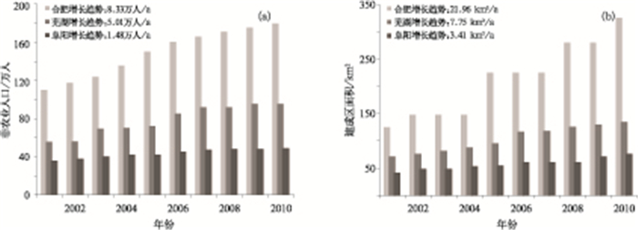 2.5 安徽省代表城市热岛效应对比安徽省代表城市在空间上存在不同程度的热岛效应,省会合肥的热岛效应最为显著,同时,安徽省南部代表城市芜湖的热岛效应强于北部代表城市阜阳。由已有的研究可知,城市的建成区面积和非农业人口是一个与城市热岛效应密切相关的重要指标[34-35]。图 7是3个城市2001—2010年非农业人口以及建成区面积的变化,数据来源于安徽省统计年鉴[15]。可以看出,近10年来,合肥市的非农业人口和建成区面积都呈现出快速的线性增加趋势,分别为8.33万人/a和21.96 km2/a,在3个城市中增长速度最快,芜湖次之,阜阳最小,与3个城市热岛效应的强弱成对应关系。