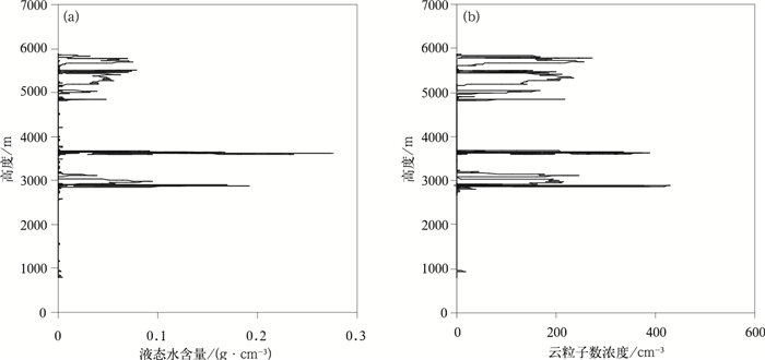 图 8为第1次飞行时段内云中液态水含量 (CDP-LWC) 与云粒子数浓度的垂直分布。与图 7中云水的垂直分布状态进行对比可以大致看出,图 8中云粒子含水量与云粒子数浓度在垂直方向上有两个大值区,分别位于5000 m与6000 m之间以及3000 m与4000 m之间。由图 7来看,云水比含水量也存在两个大值区,分别位于6000~7000 m以及4000~5000 m,模拟的两个大值区较飞机探测的大值区位置略偏高。