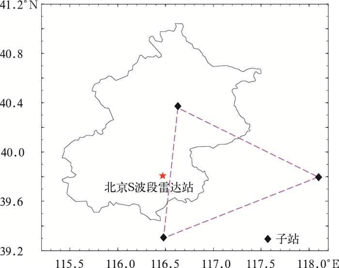 1.1 闪电资料闪电数据由京津地区的SAFIR3000三维闪电定位系统获取。该系统包括3个探测子站 (SAFIR3000三维闪电定位系统子站)(图 1) 和1个处理中心, 其采用干涉法定位闪电击穿过程中的辐射源位置,工作频率VHF为110~118 MHz,LF为300 Hz~3 MHz,200 km内的探测效率可达到90%,位置误差小于2 km。将SAFIR辐射点数据判别为闪电数据的方式如下:对于云闪,相邻辐射点在100 ms和7 km以内将被判别为属于同一次云闪;对于地闪,相邻辐射点在500 ms和7 km以内将被判别为属于同一次地闪。同时,为避免云闪被错误的判别为正地闪,按照通常做法[15],认为正地闪的电流应大于10 kA,低于10 kA的正极性数据则被判别为云闪。文中使用经过闪电判别后得到的总闪数据,不区分云闪和地闪。在雷暴过程选择中,要求雷暴位置在距离SAFIR3000站网中心100 km范围的区域,确保闪电探测的效率[16]。