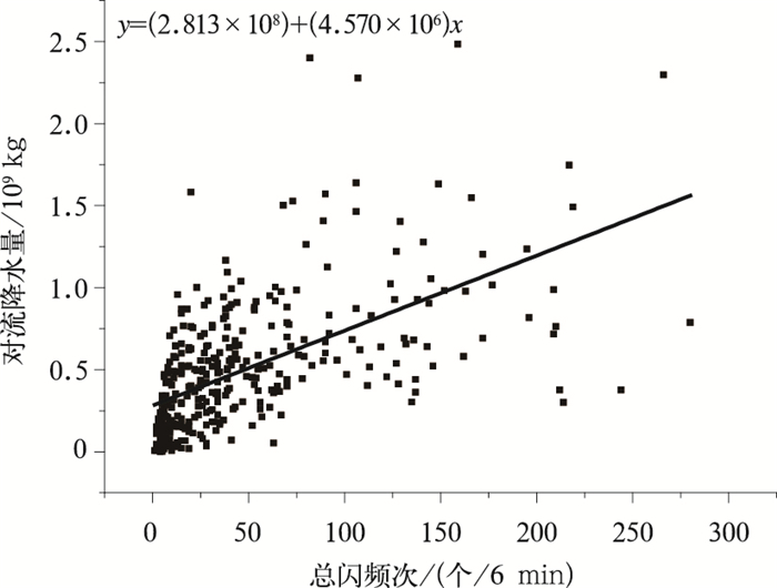 也有研究给出了闪电和降水的拟合关系。Chang等[11]研究了闪电与TRMM (Tropical Rainfall Measuring Mission) 卫星微波成像仪得到的对流降水之间的关系,指出当闪电频次S≥1/15 min时,降水强度R=1.69×S0.46-1.1(单位:mm/h);当S≤1/15 min时,无降水。周筠君等[12]根据甘肃平凉地区地闪和降水得到降水强度和地闪频次的拟合关系,相关系数为0.8641。郑栋等[8]得到北京地区总闪和对流降水量的拟合关系为MCR=1.574×107 FTL+2.956×108,其中MCR表示对应闪电频次统计时段 (为6 min) 的对流降水量,FTL表示6 min的总闪频次。