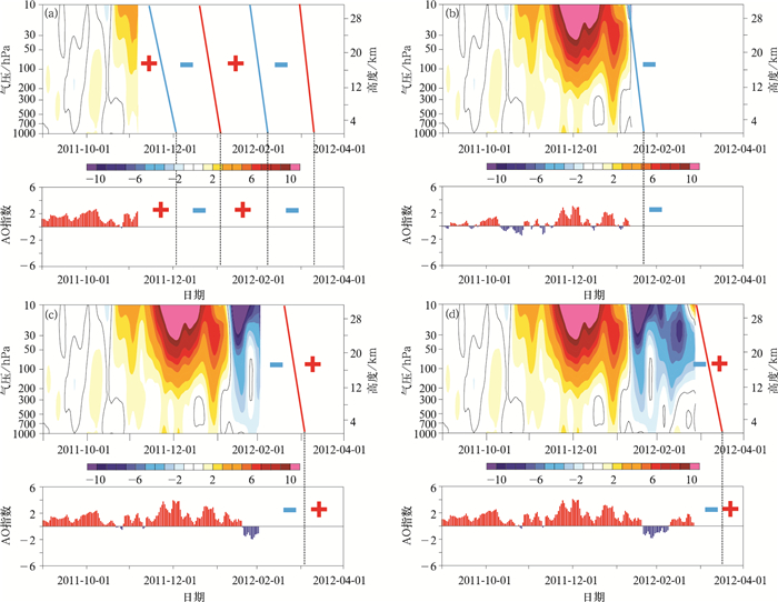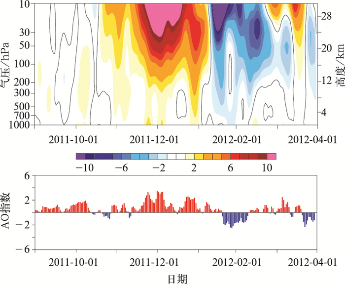 | 图 2. 2011年9月1日—2012年4月1日NAM指数时间-高度剖面图及近地面AO指数时间序列 Fig 2. Height-time cross-section of NAM indices and time series of the surface AO indices from 1 Sep 2011 to 1 Apr 2012 | |