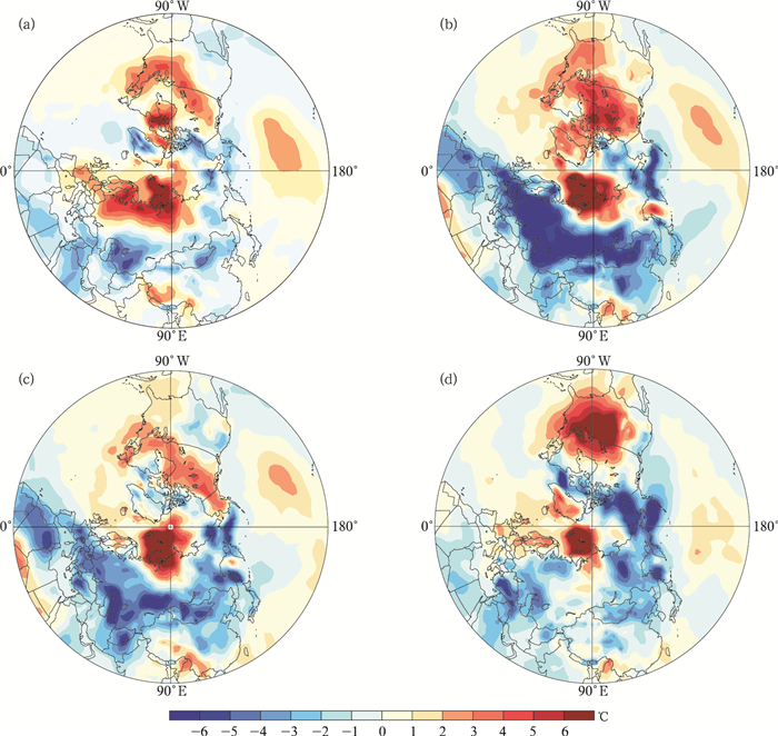 | 图 3. 2011—2012年冬季4个预测时间段北半球地表气温度距平 (a)2011年11月11日—12月31日,(b)2012年1月20日—2月20日,(c)2012年2月4日—3月4日,(d)2012年3月1日—4月1日 Fig 3. Temperature anomalies during the period of 11 Nov—31 Dec in 2011(a), 20 Jan—20 Feb in 2012(b), 4 Feb—4 Mar in 2012(c) and 1 Mar—1 Apr in 2012(d) | |