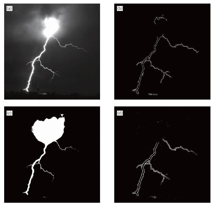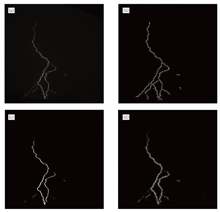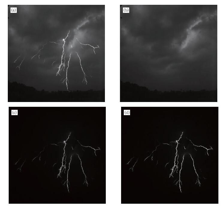 | 图 2. 图像预处理结果 (a) 闪电通道原图,(b) 背景图像,(c) 背景差法获得的闪电通道图像,(d) 增强后的闪电通道图像 Fig 2. Image preprocessing results (a) the original image of the lightning channel, (b) background image, (c) the lightning channel image obtained by the frame difference method, (d) the enhanced lightning channel image | |