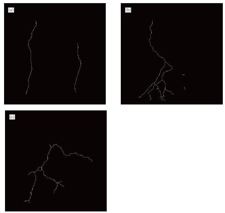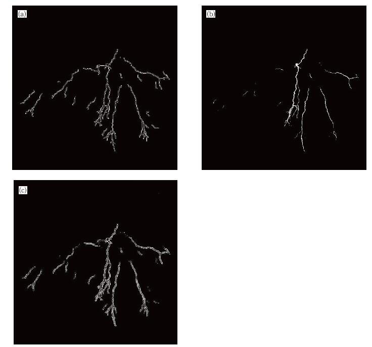 | 图 9. 闪电通道细化结果 (a) 细化结果示例1,(b) 细化结果示例2,(c) 细化结果示例3 Fig 9. Results of the morphological skeleton (a) Example 1, (b) Example 2, (c) Example 3 | |