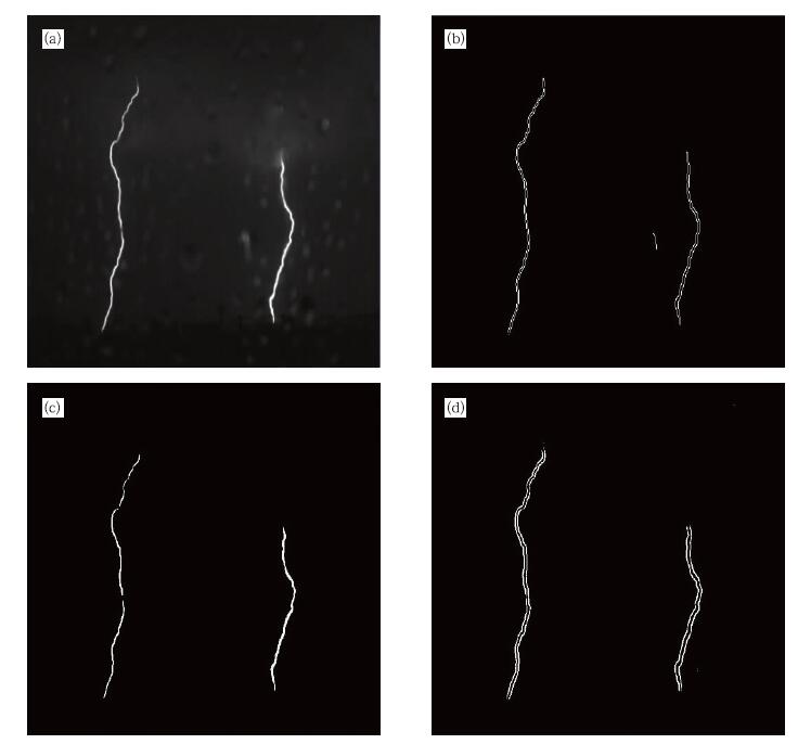 在众多的图像边缘检测方法中,Canny算子与其他边缘检测算子相比,在噪声抑制和边缘检测之间取得了较好的平衡,能够在滤除图像噪声、保留细节边缘方面获得不错的效果。Canny算子[18]边缘检测是利用高斯滤波器对图像进行平滑处理,滤除图像噪声;再计算平滑后的图像幅值和方向并进行非极大值抑制,确定候选边缘点;最后根据设置的高低阈值检测和连接边缘。为了提高Canny算子对不同图像的适用性,这里用自适应阈值的Canny算子[15]对闪电通道进行提取,将Otsu自适应计算的阈值设为Canny算子的高阈值,低阈值取为高阈值的1/2。该方法对低对比度图像的边缘提取具有一定优势。