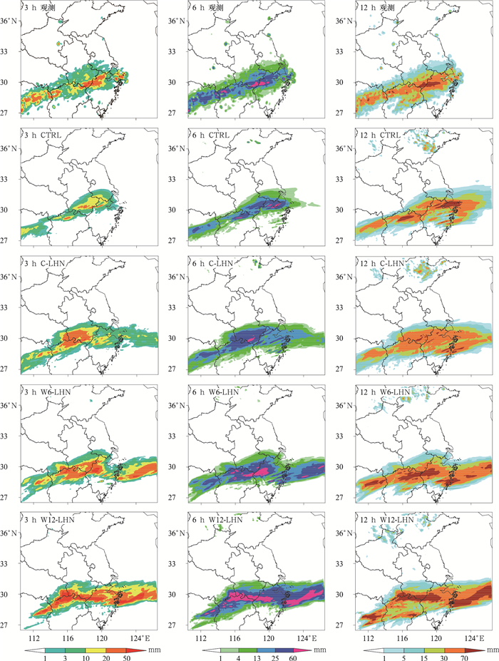 在分析了LHN方法能够改进此次降水预报的基础上,进一步对比分析冷、暖试验的预报结果。C-LHN的3 h强降水预报过于集中,几乎都分布在湖北、安徽、江西三省交界处,范围过大,而湖南和浙江两省的暴雨未能准确预报,到第6小时仍然是类似的情况,暴雨集中于三省交界处,到第12小时浙江省北部的降水增加,整体来看落区与实况较为接近,但不足的是,对于浙江省西部并延伸至安徽东南部的特大暴雨,C-LHN预报效果不够理想。与之相比,W6-LHN改进最为明显的是3 h,6 h,12 h累积降水场中湖北、江西、安徽三省交界处的暴雨预报和浙江省西北部的特大暴雨中心预报。此外,强降水的落区也更为合理。因此,与C-LHN相比,W6-LHN在强降水中心的强度和落区上都与实况更为接近。不足的是,暴雨和特大暴雨中心的范围略微偏大,存在空报现象。比较不同暖启动时长得到的降水预报效果,除了湖南,两者在降水落区的把握上基本一致,但W12-LHN预报的强降水范围过大、强度过强,特大暴雨中心几乎穿越整条雨带。