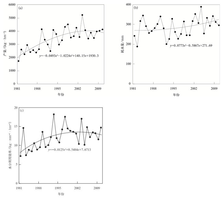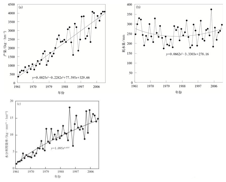 1961—2010年渑池、宜阳、临汾地区雨养冬小麦平均单产呈三次多项式曲线变化 (达到0.01显著性水平),1981年以前产量增幅较稳定,之后年际间波动增大 (图 1a);冬小麦耗水量年际变化规律不显著,且年际间波动大 (图 1b);水分利用效率的变化接近于幂函数 (达到0.01显著性水平),20世纪80年代以前稳定、快速增加,从60年代平均为3.1 kg·mm-1·hm-2增长到了80年代平均为10.0 kg·mm-1·hm-2,随后水分利用效率呈波动式增长趋势,21世纪平均为13.9 kg·mm-1·hm-2,增长速度较前期略减缓 (图 1c)。