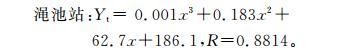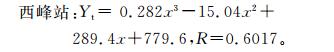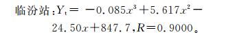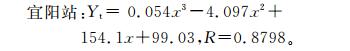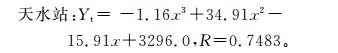 1.2 雨养冬小麦气象产量模拟针对各代表站产量资料特点,在指数、线性、对数、多项式等拟合方程中,选择与产量变化趋势相关性最高的方程拟合冬小麦趋势产量,发现各代表站均以三次多项式拟合相关系数最高。