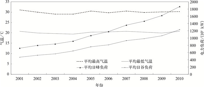 2 高低温与电力峰谷负荷变化特征及影响 2.1 高低温与峰谷负荷变化特征图 1是2001—2010年5—9月南电网区域逐日最高气温、最低气温与电力日峰负荷、日谷负荷年平均时间序列。由图 1可以看出,无论是日最高气温还是日最低气温,其年平均值只是逐年波动,10年来相对平稳,没有明显的变化趋势;而电力日峰负荷、日谷负荷的年平均值具有明显的逐年线性增长趋势;受社会经济发展等因素的影响,电力负荷呈逐年显著增长的变化趋势。气象条件只是引起负荷的波动变化。为客观分析气象条件对电力负荷的影响,采用