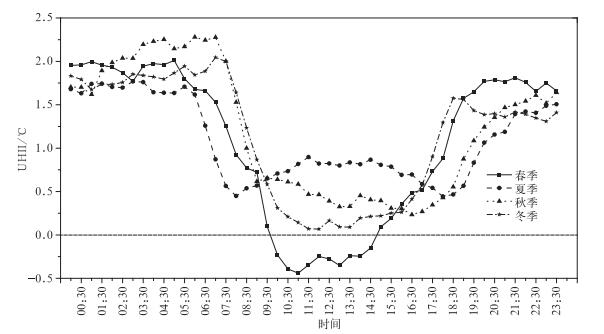 | 图 2. 2010—2011年晴好天气下四季的UHII日变化 Fig 2. Daily changes of urban heat island intensity in different seasons under sunny weather conditions from 2010 to 2011 | |